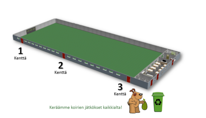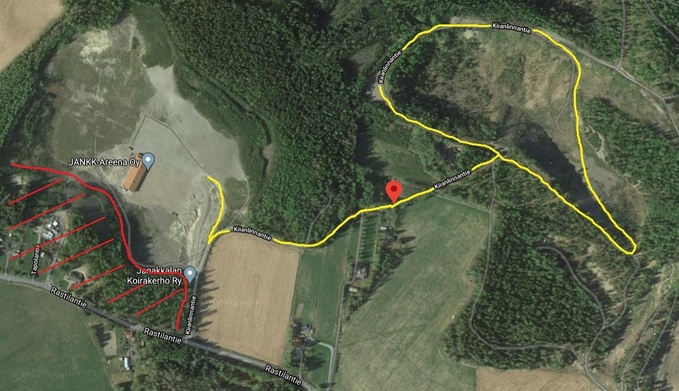 Tässä pari reittiehdotusta lämmittelylenkeiksi, reittiehdotukset on merkitty keltaisella. Hallin vasemmalla piolella olevat rinteet vievät suoraan yksityisaluelle, joten sillä alueella liikkumista on vältettävä. Koiria on ulkoilutettava kytkettyinä kilpailupaikalla ja sen läheisyydessä liikkuttaessa. Koiria ei myöskään saa päästää tarpeilleen naapureiden piha-alueille ja koirien jätökset tulee kerätä kaikkialta, jos kuitenkin kakkapussi sattuu unohtumaan kotiin niin ilmoittautumispisteestä voi hakea itselleen pussin kaiken varalle.