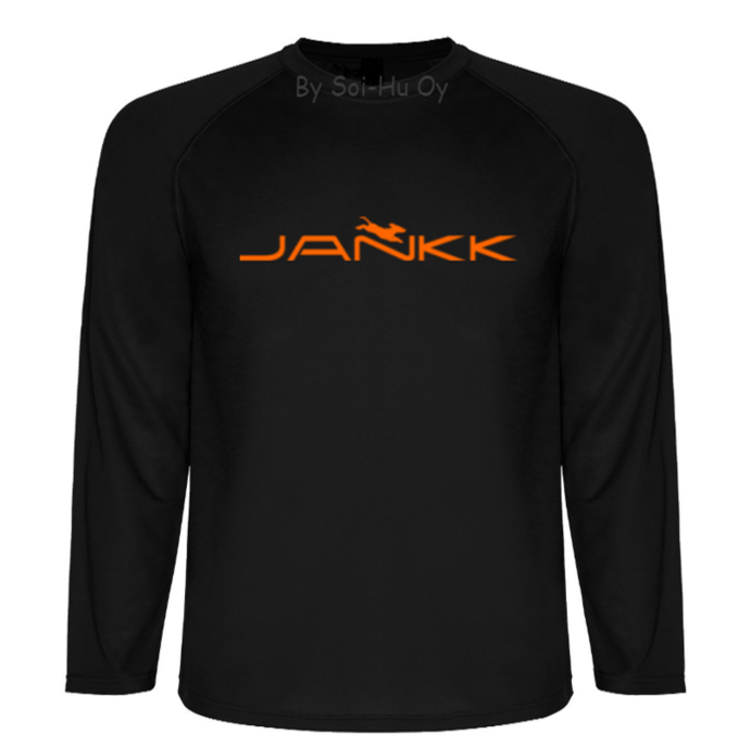Huppari, softshell-takki, college-housut, t-paita, pitkähihainen paita JANKK-logopainatuksella.