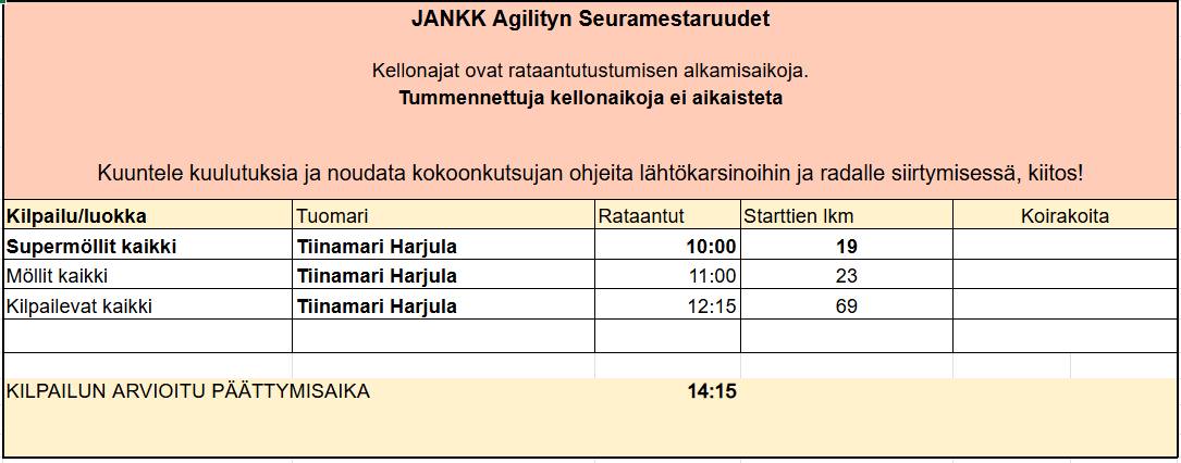 Koirakko saa mennä max. 2 starttia/luokka (pl. kepo/kety-kisa)! Voit toki halutessasi ilmoittaa koiran useampaan luokkaan.