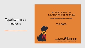 LAJIESITTELY: Lajiesittelyt hallissa, tasatunnein vaihtuva laji. Kuulutuksissa lisäinfoa. Tervetuloa tutustumaan lajeihin, rohkeimmat uskaltaa kokeilla lajeja koiransa kanssa! Aikataulu: Agility klo 11-11.45