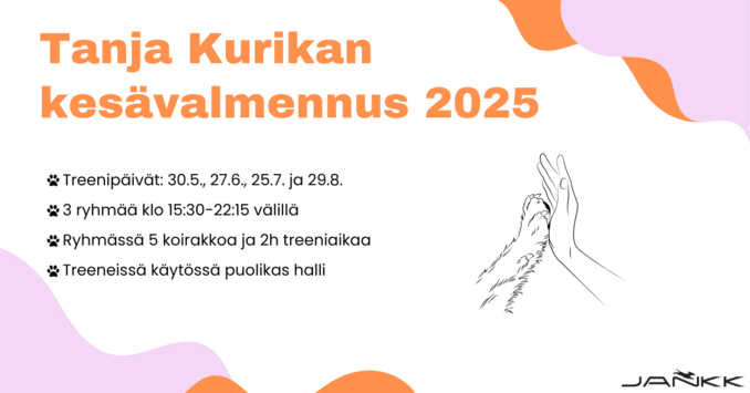 Valmentajasta: "Tanja on urheilija, joka nauttii valmentamisesta täydestä sydämestään. Agilityssä häntä kiehtoo lajin vaativuus ja fyysisyys. Tanjan valttina on radanluku, sovelluksest erilaisille koirakoille, koirien kouluttaminen ja liikkuminen. Tanja on opiskellut useamman vuoden eläinten käyttäytymistä ja kouluttamista ja janoaa aina uutta tietoa, olipa kyse sitten eläinten kouluttamisen uusimmista tutkimuksista tai fysiikkavalmennuksesta." Tanjasta voit lukea lisää hänen sivuillaan: Valmentaja – TK-COACHING
